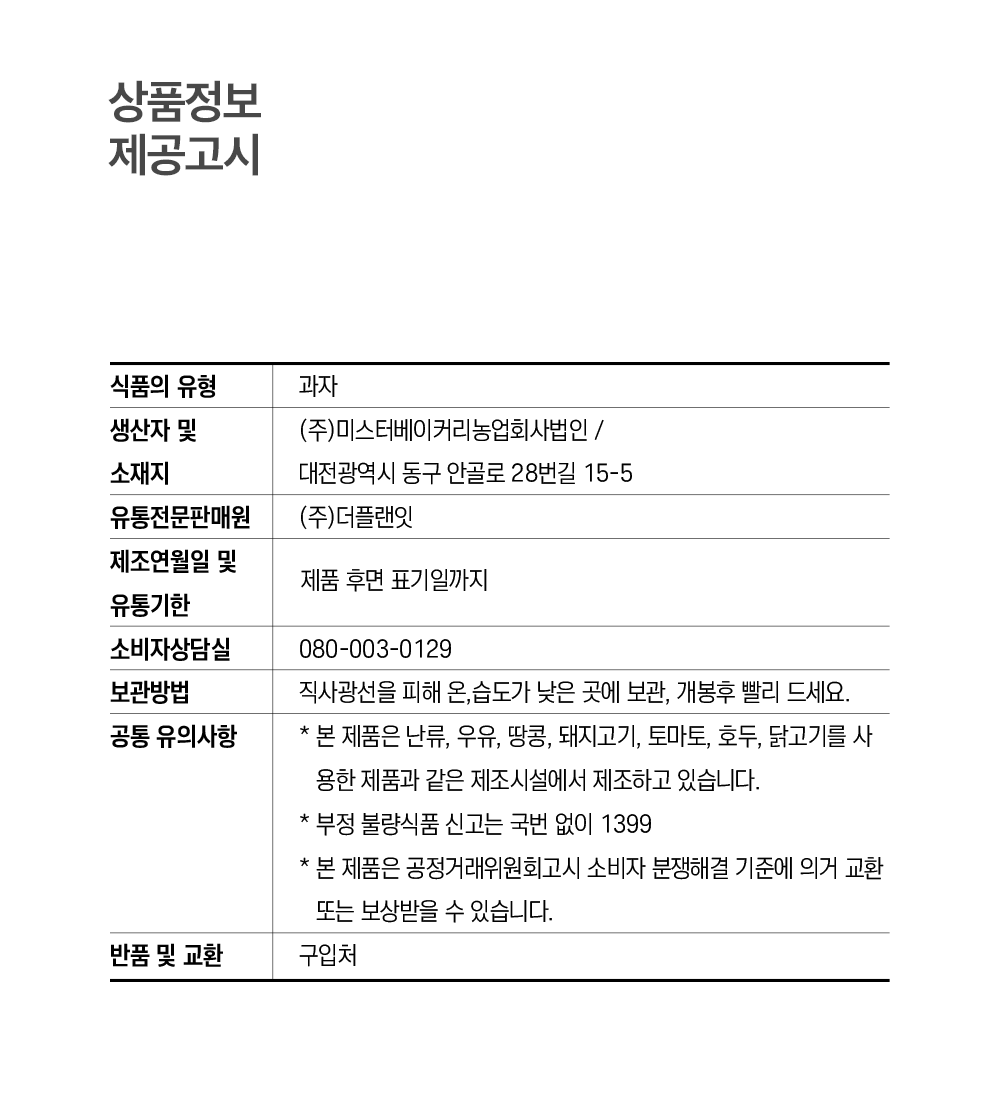 본 제품은 난류, 우유, 땅콩, 돼지고기, 토마토, 호두, 닭고기를 사용한 제품과 같은 제조시설에서 제조하고 있습니다.
